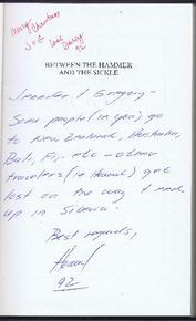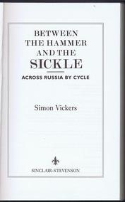 | | Since Howie Cohen's passing, no items are for sale. | | THIS BOOK IS AVAILABLE TO SELL! Between The Hammer And The Sickle-Across Russia By Cycle is a 273 page hard cover book by Simon Vickers. After negotiating with the Soviet authorities for 1 1/2 years, four men (British, French American & Russian) secured permission to cross the USSR with a freedom undreamt of since 1917. They chose to travel by bicycle from Leningrad to Vladivostock. Their 12,000 kilometer journey took them through Russia, Kazakhstan & Siberia. The dimensions are 6 1/4 x 9 1/2 inches, the condition is very good. This book belongs to John Loy. See the picture gallery. |