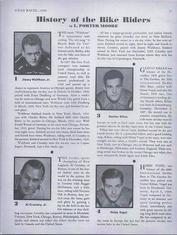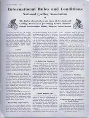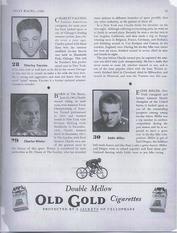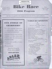 | A VERY GOOD REPRODUCTION IS AVAILABLE TO SELL; I HAD IT REPRODUCED AT A PROFESSIONAL PRINTING CO. A 52-page (including the covers) large format Program for the 61st International 6-Day Race held in New York at the Madison Square Garden from November-29 to December-5 1936. The event was sanctioned by The National Cycling Association. The dimensions of the program are 8 1/4 x 10 7/8 inches. Thirty (30) well known international professional racers are illustrated with a short bio of each. The names read like a WHO`s WHO from the history of cycling archives; Jimmy Walthour Jr.-USA, Al Crossley Jr.-USA, Gustav Killian-Germany, Heinz Vopel-Germany, Guiseppe Olmo-Italy, Emile Ignat-France, Franco Georgetti-Italy, Gerard Debaets-Belgium, William `Torchy` Peden-USA, Bobby Thomas-USA, Alfred Letourner-France, Marcel Guimbretiere-France, Jules Audy-Canada, Norman Hill-USA, Cecil `Rabbit` Yates-USA, Jerome `Jerry` Rodman-USA, Louis Cohen-USA, Henry `Cocky` O`Brien-USA, Tino Reboli-USA, George Shipman-USA, Alvaro Georgetti-Italy, Charley Yaccino-USA, Charles Winter-USA, Eddie Miller-USA and several others (see page-21 for a complete list of the competitors). The list of officials is another group of famous cycling personalities including; Frank L. Kramer, Arthur W. Ross, Nat Butler, Iver Lawson, Patrick Mulvey, Thomas Lynch, Joseph Grimm, Dan Caprio, L.A. Fraysse, Frank Small, George Scofield, Emile E. Fraysse and many more (see page-7). The program contains articles about bike racing in the day, and the history of 6-day racing. Records for past races from 1900 through 1936 are listed. This is enjoyable reading and an important piece of research material. The original Program is from the Bill Bina Collection. |