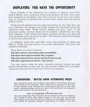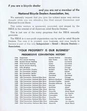 Page-11 inviting all bicycle retailers to join the NBDA and also listing the years and locations of the NBDA Conventions starting in 1946 up to & including the projected Convention to be held in 1969 in Miami Beach, FL. |