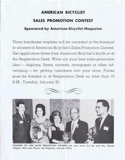 | The National Bicycle Dealers Association (NBDA) is an organization of bicycle store owners. In the past years the NBDA organized and promoted a Convention where distributors and manufacturers would display their products and hundreds of bicycle store owners and employees would attend to see the latest items and order merchandise. It was always beneficial to have face-to-face meetings between the customers (dealers) and suppliers (distributors & manufacturers). This is the 12-page program for the 22nd Annual National Bicycle Show which was held at the Ambassador Hotel in Los Angeles. The last page (outside back cover) contains a photo of some of the Los Angeles area Distributor executives including; Howie & Leo Jr. Cohen (West Coast Cycle), Phil & Pete Mole (John T. Bill Co.), Rudy Seidler (United Import Sales), Bill Ellis (Harry Wilson Sales), Bart Ralston, Hank Smith, Ken Reaume (State Distributors), and William (Bill) Flannelly (Schwinn Bicycle Co.). The image shown here is page-1 the outside front cover. See the picture gallery for the other 11 pages. Bike industry old timer & friend Pete Mole kindly sent me this program from his collection.| Picture Gallery for this Item (click images to enlarge) |