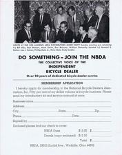 Page-12 the outside back cover containing an application form for Dealers to join the NBDA. The top half of the page contains a photo of executives of some of the active Distributors in the Los Angeles area; (seated L-R) Howie & Leo Jr. Cohen (West Coast Cycle), Phil & Pete Mole (John T. Bill Co.), Rudy Seidler (United Import Sales), (standing L-R) Bill Ellis (Harry Wilson Sales), Bart Ralston, Hank Smith, Ken Reaume (State Distributors), and William (Bill) Flannelly (Schwinn Bicycle Co.). |