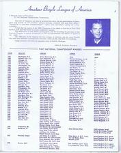 | | Since Howie Cohen's passing, no items are for sale. | | This is the 42-page Souvenir Program for the 1969 USA National track & road Championships which were held in Detroit, MI. The Program was published by the Amateur Bicycle League of America (ABL of A). The front cover is a photo of nine of the 1968 National Champions. The dimensions are 8 1/2 x 11 inches. This Program is full of names of riders, ABL of A Officials (many of them ex-racers), pictures of people who are interested in and support and/or race bicycles, adverts from bicycle industry companies, and much more valuable information. When time permits I plan to scan some additional pages and mention the names of the people involved. |