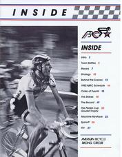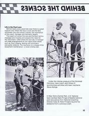 Page-13, Behind the Scenes describing the activities of the coaching and the mechanic in charge of the equipment. Some very well known bike racing personalities are pictured; Jack Simes III, Steve Aldrige, Coach Eddy B & racer Mark Pringle. |