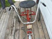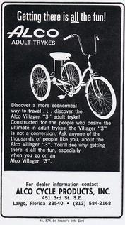 | | This Alco adult tricycle belongs to Robert Rosenbalm in September of 2010. It has 20x1.75 tires so it sits low to the ground (has a low center of gravity & is quite stable) and would be suitable for a shorter person. It is available to sell; if interested contact Robert by telephone at (740) 441-1261. The trike is located in Gallipolise, Ohio which is located near Charleston and/or Huntington, West Virginia. Alco produced adult 3-wheel tricycles in Florida as early as 1972. This unit was originally sold to a consumer by Bob Anderson`s FIRESTONE STORE of Fort Meyers, FL. |