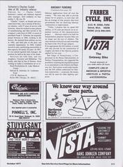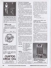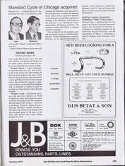 Page-109: (1) A continuation of RACING NEWS from page-104 mentioning Leigh Barczewski, Jerry Ash, Gibby Hatton, Connie Carpenter, Carrie Peterson, Jane Buyny, Heidi Hopkins, Sue Novara, & Connie Paraskevin. (2) An article regarding the acquisition of assets of Standard Cycle & inventories of Oxford International by Bicycles Inc (Bob Fluhr). Pat McKenna was named as VP/general manager of Standard. (3) An article about Huffman making two personnel announcements of Harvey L. Ackerman & Brock A. Robertson. (4) adverts for Gus Betat & Son of New Orleans and J&B of Miami. |