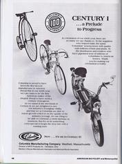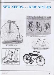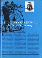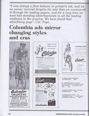 Page-47, the first page of a multi-page article giving the history of Columbia, the oldest bicycle company in America. Columbia celebrated their 100th Anniversary in the American Bicycle Industry. Many other firms in the bike industry sent their congratulations to Columbia in adverts within this issue. Here is a brief timeline: Columbia started as the Pope Mfg. Co. in Hartford, CT. Torrington Co acquired the company in 1933 and changed the name to The Westfield Mfg. Co. Norman A. Clark (and his newly formed corporation) acquired the company in 1969; the name was changed to Columbia Mfg. Co. MTD Products Inc of OH acquired the company in 1967. |