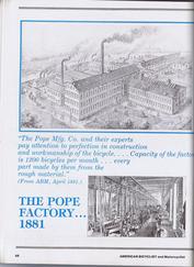 | | Since Howie Cohen's passing, no items are for sale. | | The American Bicyclist and Motorcyclist magazine is a consolidation of several prior bicycle publications which were acquired and/or merged through the years. Ultimately, David Meyers purchased the publication and renamed it The American Bicyclist and Motorcyclist. David`s wife, Florence and son Stu were both active in the business. Each monthly issue is full of editorial and advertisements that chronicle the bicycle industry for the period. Howie & his family worked closely with Stuart Meyers for many years. Stu sold the publication in the 1990s and it is currently being published by The League of American Bicyclists, the format is quite different from when the Meyer`s family was publishing; it is now slanted toward advocacy & touring. This issue includes a multi-page article in recognition to the Columbia Manufacturing Co on its 100th Anniversary and several other interesting articles. The dimensions are 8 1/4 x 11 1/4 inches. See the picture gallery. |