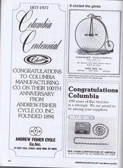 Page-74 with two adverts congratulating Columbia on their 100 year Anniversary, from Andrew Fisher Cycle Co & HKK Chain Corp of America. |