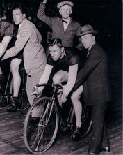 From the United States Bicycle Hall of Fame at http://www.usbhof.com/inductees/1996.cfm John "Pop" Brennan grew up in Newark, NJ at the height of cycling popularity in the United States. He started racing in 1904 winning the Diocesan Union Championship. He turned Pro after winning an amateur 6-day race in Atlantic City, NJ. He retired after a short pro career and opened a bike shop where he made custom handlebars and wheels for some of the cycling greats like Frank Kramer and Alf Goullet. He set up his portable bike shop at many of the tracks that hosted six day races, including Madison Square Garden, the Chicago Coliseum and others in North America and Europe. His shop became a repository for scrapbooks, photos and oral and written history of the golden age of American cycling. His history is now a part of the United States Bicycling Hall of Fame. This picture is of Pop Brennan holding ace racer Alf Goulett at the starting line of a track race.