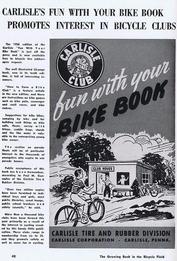 A press release that was published in the November 1957 issue of Bicycle Journal. Carlisle produced a 52-page book titled FUN WITH YOUR BIKE BOOK (tenth edition) and they distributed it free to the Carlisle jobbers. Over two million copies have been distributed since the first edition was published. |