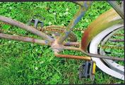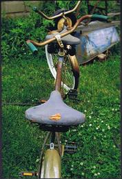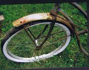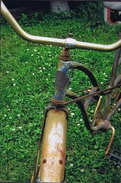 | | We are trying to determine the correct model year for this fat tire coaster brake tandem (we think 1939-1942) with interconnected steering (steering can be controlled by either the captain or stoker). The fenders appear to be replacements as do the grips and pedals and the seats need some attention. The expander bolt on the front stem is missing and the paint is rough but this tandem could be restored to a beautiful ridable gem. The curves of the frame tubing are graceful and attractive. See the picture gallery. This tandem has been sold. |