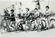 The Ingo-bike was invented by two brothers, Phillip and Prescott Huyssen, during the early 1930′s. Its safety and versatility - two could ride as easily as one – made it a healthy source of family fun. The Ingo’s revolutionary driving principle was akin to perpetual motion, and its ride was compared to “the sensation you get standing at a ship’s bow enjoying the lift and lull of the rhythmic swell as the ship rides high on the crest and gently falls into the trough of the wave.” It was touted at the time as the “first great advance in wheels in almost half a century.” Phillip Huyssen got the idea for the Ingo while he and Prescott were returning home from the Chicago World’s Fair. They were riding in the upper deck of a double-decker bus in order to enjoy the view. While riding south on South Park Avenue, Phil began to watch a group of small boys riding home-made scooters. The scooters were made of 2×4′s and used a roller skate for wheels. One board was used to stand on, one to steer, and a cross-stick was used for handle-bars. One boy was using a 1×6 instead of a 2×4 to stand on, and when he pushed off, the board would hit the sidewalk and act as a brake. As Phil watched the boys, he got an idea, and told Prescott that if the rear wheel hub was off-center, the scooter could be propelled by pulling on the steering bar, and using a little “body English.” The two brothers went home, and began to work on their idea. They built a number of scooters with various size wheels and experimented with putting the eccentric wheel in the front and then in the back. These being depression days, there was no work and the banks were closed, the brothers were short of money and often had to improvise. The first working Ingo had a 12-inch front wheel and a 36-inch rear wheel. They tried it out on a cold winter night, but avoided riding in their neighborhood at 70th and Calumet in Chicago, as they feared the neighbors would think they were crazy. This first success greatly encouraged the Huyssens, as they had invested hard-to-get money into their invention. They continued their work and made a final prototype with an 18-inch rear wheel made of 3/4-inch plywood wrapped in hard rubber. The bike received U.S. patent no. 1,679,819 with others pending. The Huyssens took their prototype to Derinforth, Lee, Criten, and Wiles-Patent Attorneys. They demonstrated their invention to their attorney, Horace Dawson, by riding it in the hallways of the office building, and he liked it very much. The brothers borrowed some money and had movies made to show the Ingo in action. They took it to the Toy Fair in New York City where the bike was a hit. The Huyssens received hundreds of tentative orders while they were at the New York’s McCalpine Hotel. On their return from New York, Mr. Dawson recommended giving the idea to Borg-Warner Company, a manufacturer of automobile, home appliance, aviation, marine, and agricultural products. They decided to release the Ingo-bike idea to Borg-Warner Company, who then transferred it to a subsidiary, Ingersol. The two brothers then spent some time testing the design at the Borg-Warner plant in Rockford, Illinois. Production of the Ingo was set up in the fall of 1934. Many mistakes were made in the first construction, and a second, improved version was later developed. The second version was quicker and easier to ride, but it still had one drawback, its curved, steel platform supports would crack between the wooden riding platform and the rear wheel when the bike was ridden too hard. Then the rider would have to take the two halves of his broken Ingo to the nearest welding shop. The bike was also very heavy which provided the rider with good exercise or a lot of work, according to his point of view. Unfortunately, the Ingo was only manufactured for a short time. Production stopped in 1937, when the building the Ingo was made in was converted into an army shell factory. Then World War II broke out, and the Ingo idea was side-tracked. The Ingo is both a novel and practical invention. It steals the show at any parade, and can be used in eye-catching tricks, such as jumping over low-fences, and pyramid riding in which a group of people form a pyramid while riding on an Ingo. In Hollywood it was pictured in many magazines, ridden in movies and in a Three Stooges comedy and it was featured in the Pathe News. In the 1930′s, rental agencies from Hollywood beaches, to New York’s Central Park, did a substantial business renting out Ingos and teaching people how to ride them. They often gave out membership cards, which allowed the carrier to ride for free, after having paid for a certain number of rides. Games such as Ingo-polo became popular. Regular Ingo races were held at Victor McLaglen’s Hollywood Sports Center in the ’30′s, and today these bikes which can reach speeds of up to 20 miles per hour are raced on the quarter-mile track at Wheelmen meets. The Ingo is not only fun to ride, it is also one of the safest bikes ever invented. The riding platform is only six inches from the ground, so injuries from falling or being bounced off are unlikely. There are no chains, sprockets, or gears to catch fingers or clothes, and the fenders prevent both flying mud and injuries from the wheels. When compared to modern-day 10-speeds, the Ingo bike doesn’t seem to be a distance machine, but its inventors proved otherwise. On one of their early rides, Prescott and Phil rode from Chicago to Milwaukee, Wisconsin, in 8-1/2 hours. On another long and widely publicized ride, Phillip Huyssen rode from Chicago to Miami, Florida, in April, 1935. The trip took him 12 days, and on his arrival he was officially greeted by the mayor of Miami. Six Ingos were shipped to Florida for publicity on his arrival, and many people learned to ride there. This ride also led to the Ingo being featured in the Miami Chamber of Commerce promotional magazine. The inventors weren’t the only people