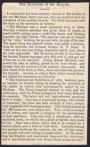 Click on this thumbnail image to see a greatly enlarged image that is easy to read. This is an article published in about 1895 relating to the monument that was recently erected at Bar-le-Due to the two Michaux's; father and son. The Michaux's are credited with inventing the first bicycle with pedals. . .read the article.