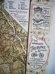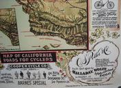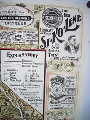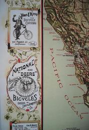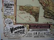 | | Since Howie Cohen's passing, no items are for sale. | | This poster is a wonderful old 1896 map of Northern & Central California and stretching down to the Santa Barbara coast. Many bicycling roads are shown as are the grades. There are several adverts for bicycle brands including; Fenton, Credena, Spalding Columbus, Lovell-Diamond, March-Davis Cycle Co of Chicago, Tribune, Union, Barnes, Halladay, Wolff, Sylph, Overland, Victor (Overman), National & Deere. There are also adverts for retail & wholesale bicycle companies, including; Columbus Buggy of SFO, W.R.Evans Co of SFO, Park Cyclery, Premier Cycle Co., L.S.Martel & Co of SFO, The Wheelery of SFO, Hooker & Co of SFO, Cooper Cycle Co of SFO, C.S.Potter & Co of SFO, Thos.E.Kent Cycle Clothing & Si-Ko-Lene Chain Lube. Disregard the round objects on the edges; they are magnets used to hold the poster for photographing. I did not get the camera positioned in the center and therefore the image is not square. See the picture gallery. The dimensions are xxxxxx inches. |