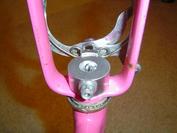 | This 1980 Schwinn 20 inch wheel coaster-brake Fair Lady (serial number MR841044) belongs to Luke DeNitto of CA in Sept-2010. Luke is in the process of restoring this bike while changing it from a coaster brake model to a derailleur gear multi-speed bike. This is a work in process so additional photos will be added as Luke sends them. There are several other bikes belonging to Luke DeNitto posted in this category of this web site. Luke has been very generous sharing his time & expertise with other collectors. Here is Luke`s story: A few weeks ago, I came across a $40.00 garage sale Pink Fairlady identical to the one my 9 year old daughter rides, and thought.....I should convert this rusty wheel single speed bike to a 5 speed. So off I went to my local Bike store and purchased 2 aluminum rimmed 20` wheels with the rear wheel having the threads for a freewheel. I made a spreader tool that precisely widened the rear of the frame by a 1/2 inch on each side and the new aluminum rear wheel fit right in. I then found several Schwinn NOS five speed lever shifters and installed one on the head tube. You might say...`hey Luke...no coaster brake means no brakes at all, because this frame won`t support caliper brakes`. Well this one is going to be fenderless to accomplish this task so look at the aluminum adapter I turned out on the lathe to hang the front caliper. I am going to make a a rear aluminum mount that mounts to the fender bracket on the frame that will follow the contours of the frame perfectly and mount the rear brake so it looks as natural as the front. Throw on a Schwinn Derailleur and walla..the conversion is complete with front and rear brakes. This conversion uses all Schwinn parts with the exception of my two fabricated brake frame mounts. I think I can make this a kit and it just might spark an interest in those single speed Stingrays that collectors only use as parts bikes for the factory 5 speeds. If nothing else...it keeps me busy in my garage...... More pics coming........| Picture Gallery for this Item (click images to enlarge) |