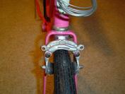 This is a photo of the bike upside down showing Luke's caliper brake adapter on the underside of the Ashtabula fork. This photo shows the front side-pull caliper brake facing forward. Luke has designed and produced an ingenious manner for attaching a front caliper brake to a fork which was not originally designed for such. If you need an adapter like this, contact me & I will ask Luke to make contact with you. |
