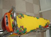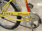 | This bike was built and belongs to Dan who resides in the Midwest. It is said that Schwinn only produced about 80 of this model and it was never released for sale. It was produced to commemorate the 30th Anniversary of the release of the Beatles song, Yellow Submarine. Erick Elsegood has one of the original bikes still in the carton, NOS! These pictures gleaned from the Schwinn web site at: http://www.schwinnbike.com/forums/showthread.php?t=68403. Dan`s handle on the Schwinn web site is 67RamsHorn The following text and photos were posted on January 20, 2009: Well I finally got it done last night. It took awhile but I wanted to make sure I did it right. P.S. I want to thank Sonny House for all of his great help on this bike. Sonny sent me detailed pictures and we talked on the phone several times. I could not of done this bike without Sonny`s help. Thank You so much Sonny, `Your the Man`. I owe you and hopefully I can return the favor. Thanks again, Dan. I bought the seat and decals on ebay (I got lucky and the timing was great). I took a 1999 NOS stingray frame and had it sand blasted, painted yellow and red. I bought a 1999 apple krate in the box and used all of the parts except the frame and guard. I bought a NOS guard and had it painted. After the frame and guard were painted I applied the decals and took it back the painter to have 4 coats of clear applied. Thanks again, Dan.