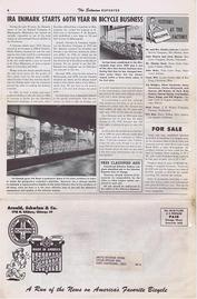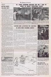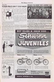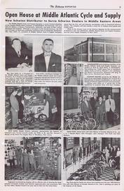 | | Since Howie Cohen's passing, no items are for sale. | The Schwinn Reporter publication was produced monthly by Arnold, Schwinn & Co starting in the early 1950`s. It was the Schwinn House Organ, full of information about the Company, its products, its Franchised & Authorized Dealers and the bicycle industry. The Reporter was written specifically for Schwinn Dealers and was mailed to them each month. Whether it`s Cruisers, Krates, Sting Rays, Paramounts or Collegiates, you can see the evolution of the Schwinn bicycle line and the company by simply reviewing the pages. Each Schwinn Reporter is an extremely valuable piece of reference material. The Schwinn`sters written about in this issue include: Max Lipski, Henry Ferri, Henry Samuelson, Stanley Kozy, Charles Pinnell, Carl Smith, Bill Madden, Velmo Chappius, Fritz Kuhn, William George Steltz Sr. & Ernie Keller (both of Middle Atlantic Cycle & Supply), Charles Seiden (president of Lewis Supply Co), Jack & Francis Hardwick and Ben & Pearl Weitzman (all of Hans Johnsen Co), Ira Enmark and others. There are many more articles and people to be named in this issue; when time permits I will come back to it and embellish this posting. This issue contains 6 pages. The dimensions are 10 x 17 inches. See the picture gallery. |