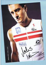 Michael Weiss is a professional triathlete competing in 2009-2010. This is a marketing card printed on both sides. He is sponsored by SRM (PowerMeters) and Cannondale.