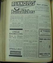 | | Since Howie Cohen's passing, no items are for sale. | | This is the front cover of the first issue in this hard cover book containing 26 issues covering the six month period of January 3rd through June 27th, 1918. These are Volumes LV, numbers 1407 - 1432. Reading this publication gives you an awareness of the British cycling scene through the years. The photos, illustrations and advertisements are splendid. The dimensions of the magazine are 8 x 10 1/4 inches, the hard cover binder is 8 1/4 x 10 1/2 inches, the condition is fair-good. See the picture gallery. |