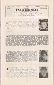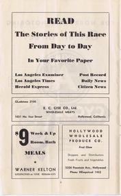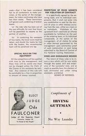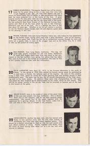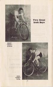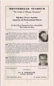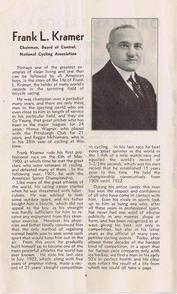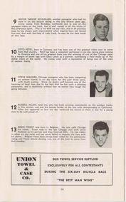 | | Since Howie Cohen's passing, no items are for sale. | | A 23-page program for this International Six Day Bicycle Race that was held at Gilmore Stadium in Los Angeles, CA. The center-fold pages list the 26 riders (13 teams), their team colors and affiliation. Page-4 has a wonderful story (tribute) to Frank Kramer, one of America`s top bike racers. In the 1950`s Howie attended many baseball games at Gilmore Stadium (located in the Fairfax district) as a member of the Knott Hole Club, a supporting fan club of the Hollywood Stars Baseball Team. The dimensions are 6 1/8x 10 inches, see the picture gallery for all of the pages. |