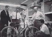 A close-up view of the 4 sales guys (plus Ken Reaume, the AMF Factory Rep) discussing the new Hercules 10-speed. (L-R) Herb Gold, Howie Cohen, Tommy Griffin, Ken, Leo Cohen Jr. |