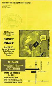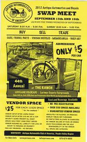 | This is one of the largest bicycle, bicycle parts and bicycle memorabilia swap meets held in Colorado. There is usually a large number of exhibitors and buyers. The detailed information is: Dates & Times: Saturday September 15, 2012 8:00AM to 5:00PM, Sunday September 16, 2012 8:00AM to 3:00pm. Location: Loveland, Colorado at the Larimer County Fairgrounds near I-25 & Exit 259. Admission: $5.00 per car. See more details on the brochure shown in the picture gallery; click on the thumbnail image to see an enlarged image. This swap meet draws hundreds of bicycle and automotive collectors.| Picture Gallery for this Item (click images to enlarge) |