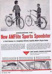The AMF AMFlite Sports Speedster advertised in the January 1964 issue of the American Bicyclist magazine. Notice teh rear spring clip carriers off the back wheels. It appears that the fenders have a rounded shape rather than the angled peak of the earlier Roadmaster models. |