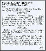 Page-53, the beginning of an article by Peter Zamora about the 1958 California Road Racing Championships in Atascadero, CA. Mentioned are; Michael Hiltner, Tom Sparks, Joe Ballinger, George Koenig, Dave Waco, Steve Hilgers, & Jim McIver. |