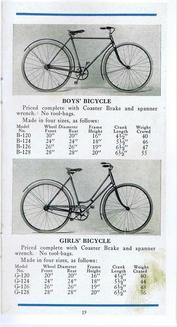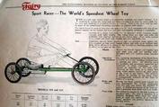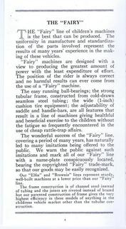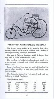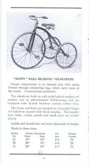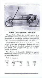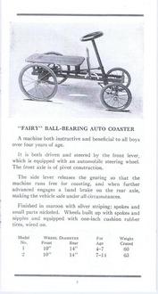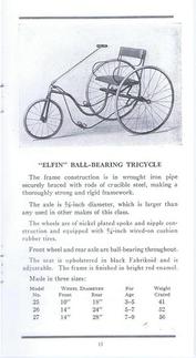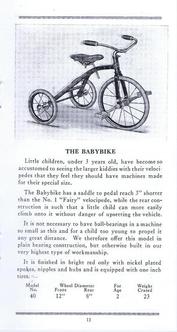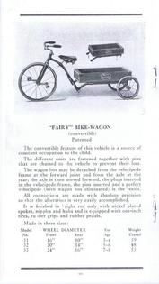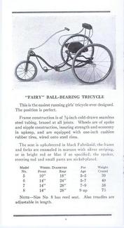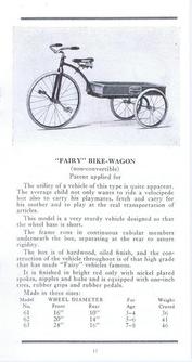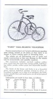 | AVAILABLE TO SELL IS A PROFESSIONALLY PRINTED REPRODUCTION REPRINT (it is difficult to differentiate between this original and the splendid reproduction). This is a photo of the front and back cover (spread open) of the Colson 20-page catalog for the 1911 line. They had branch offices and warehouses in New York, Boston, Chicago, Philadelphia and Los Angeles (1317 Willow St). The Fairy line is the best that can be produced, boasts the text in the catalog. The illustrations are of; tricycles, an auto coaster, handkars, a scooter, bike-wagons, a trailer, and a boys and girls bicycle. There are 20 pages (including the covers), the condition of the original is good, there are some pencil writings on a few pages. The dimensions of the original are 3 1/2 x 6 3/4 inches, the reproduction is 3 1/2 x 6 1/2 inches, photo #046. Four models of Colson reproduction tricycles are now available. See the information at http://www.wilsonbike.com/pdf%20catalog/cycles/05_cycles_juv%20trikes.pdf |