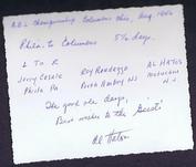 | | Since Howie Cohen's passing, no items are for sale. | | The picture is of three gents on a triplet (L to R) Jerry Casale of Phila, PA, Roy Randazzo of Perth Amboy, NJ, and Al Hatos of Metuchen, N.J. Al`s hand writing is: A.B.L. Championship, Columbus, Ohio August 1946 Phila to Columbus 5 1/2 days. The good ole days, Best wishes to the Geists`. Al Hatos was a strong supporter of bicycle racing & touring. He photographed many events over the years he was active. |