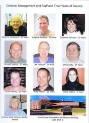 The inside back cover containing pictures of some of the employees (and their number of years at the company) at Ochsner International, Inc. Pictured are: Othon H. Ochsner-II 35 years, Eugene Johnson 35 years, Cahterine Johnson 33 years, Russell Trebilco 30 years, Bill Johnson 27 years, Jeff Goolsby 27 years, Jamie Hawley 22 years, Rudy Riemer 22 years, Daria Trebilco 3 years, Delores (Del) Ochsner Swider retired. |
