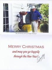 | Gene Smith`s (aka Smitty) Holiday Greeting card this year (2012) is custom printed for him. The front of the card bears an image which was used by my brother on one of his Christmas Cards of years past. The picture on the inside of the card is of Smitty standing next to a large steel sculpture of a chicken named Stu (it`s really Stew like from Chicken Stew). The picture was taken in Smitty`s residence backyard, which by the way, contains an abundance of bicycle sculptures & bicycle memorabilia.| Picture Gallery for this Item (click images to enlarge) |