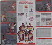The reverse side showing the new CYCLE-PRO Greg Hill line of BMX bikes & components. Pictured are some team riders. The team trainer was Jeff Spencer. |