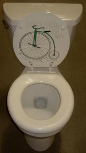 AVAILABLE TO SELL, I HAVE A DUPLICATE! A toilet seat and top with a high wheel printed on the inside of the top. See the picture gallery.