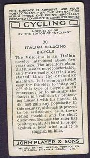 | | Since Howie Cohen's passing, no items are for sale. | | AVAILABLE TO SELL, I HAVE DUPLICATES! The front and back sides of card #30 illustrating and describing an Italian Velocino Bicycle of the 1930`s or early 1940`s. The series contains 50 cards produced for John Player and Sons (a cigarette company), branch of the Imperial Tobacco Company, Ltd. of Great Britain and Ireland. I will not include photos of all 50 individual cards but at the end of this category you will find photos of the front of each and every card, plus photos of two Souvenir Books with all 50 cards mounted. Additionally there is a framed wall hanging piece containing 20 of the cards. The dimensions of each card are 2 5/8 x 1 3/8 inches. |