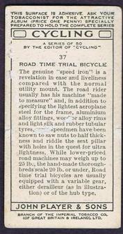 | AVAILABLE TO SELL, I HAVE DUPLICATES! The front and back sides of card #37 illustrating and describing a Road Time Trial Bicycle. The series contains 50 cards produced for John Player and Sons (a cigarette company), branch of the Imperial Tobacco Company, Ltd. of Great Britain and Ireland. I will not include photos of all 50 individual cards but at the end of this category you will find photos of the front of each and every card, plus photos of two Souvenir Books with all 50 cards mounted. Additionally there is a framed wall hanging piece containing 20 of the cards. The dimensions of each card are 2 5/8 x 1 3/8 inches.| Picture Gallery for this Item (click images to enlarge) |