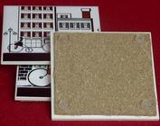 | AVAILABLE TO SELL, I HAVE A DUPLICATE! A ceramic tile trivet; there are three different designs to choose from or get all three. The tile size is 4 1/4 inches square. The underside is cork lined and has four plastic feet (plastic bumper pads) in all four corners to protect the surface upon which you are placing hot pots or serving platters. Also used as a coaster for hot or cold drinks. The #1 design shown here has a gent and lady riding high wheel bicycles in front of a building. The colors are more vivid that shown in this picture; they are red, black, coral, yellow and gray. Individually boxed. See the picture gallery.| Picture Gallery for this Item (click images to enlarge) |